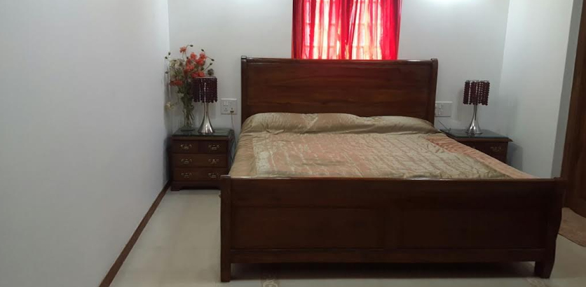 Modern teakwood bedroom set with panelled headboard in fabric and wallpaper, finished with melamine polish. (polish colour & size as per client’s choice).